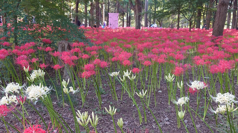 赤い彼岸花が埋め尽くす中、場所によっては白の彼岸花が咲く所も