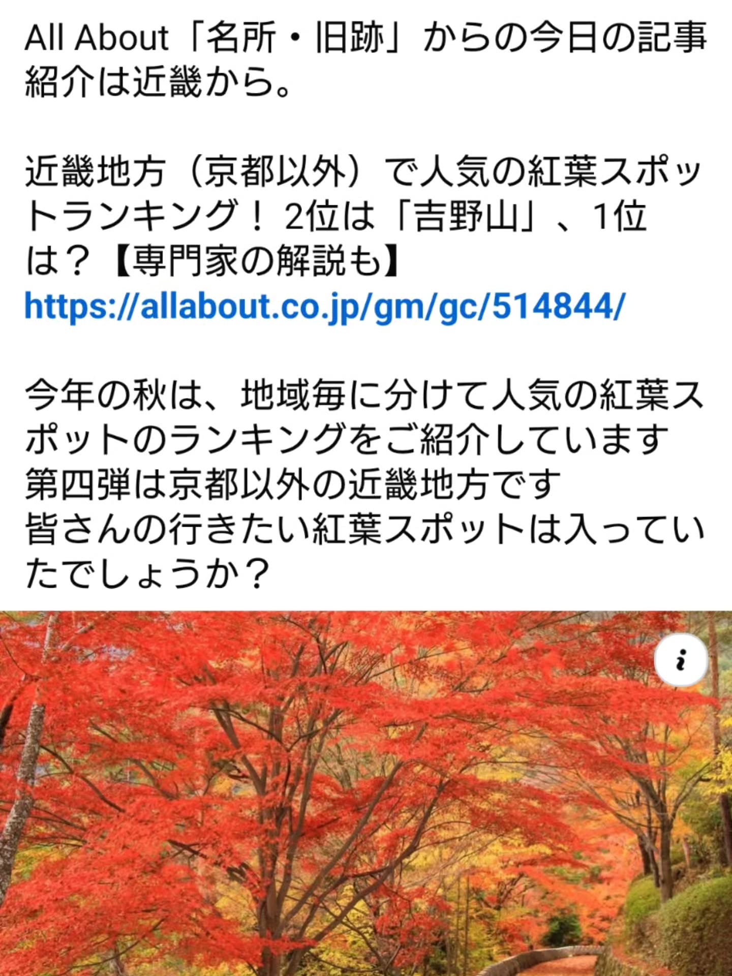 ◇近畿今年の秋は、All About編集部が集めたアンケート結果から、各地域で行きたい紅葉スポットの人気ランキングを紹介する記事に協力しています