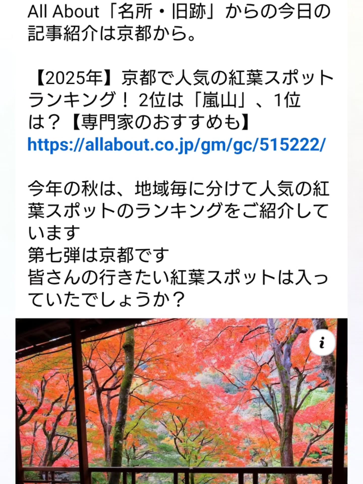 ◇近畿今年の秋は、All About編集部が集めたアンケート結果から、各地域で行きたい紅葉スポットの人気ランキングを紹介する記事に協力しています
