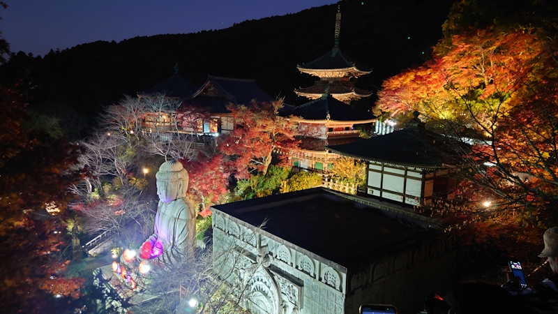 和傘を携えた大仏さまとライトアップされた紅葉と三重塔