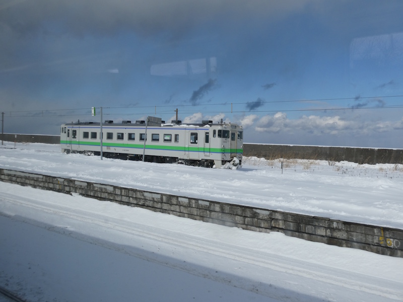 青空も広がる雪景色の中、海側の線路にキハ40が止まっていました