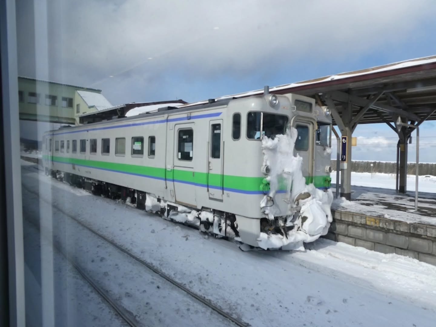 サボがないので行き先は不明ですが、前も後ろも雪まみれのキハ40が向かいのホームに止まっていました