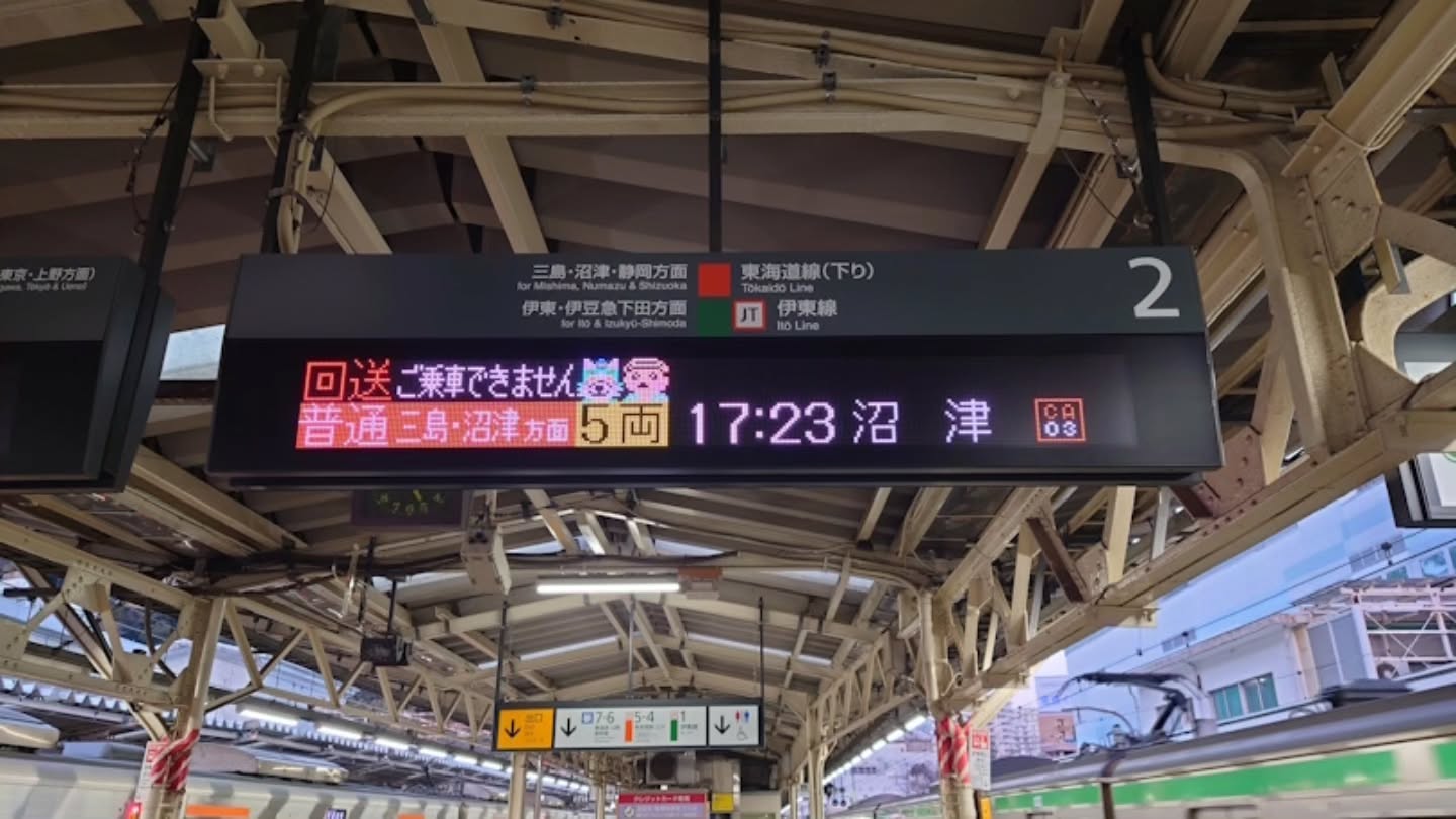 2番ホームの案内では、回送の案内の横に熱海温泉ホテル旅館組合公式キャラクター・あつお や熱海駅の駅長見習い・あたゆ丸のドット絵が出ていました