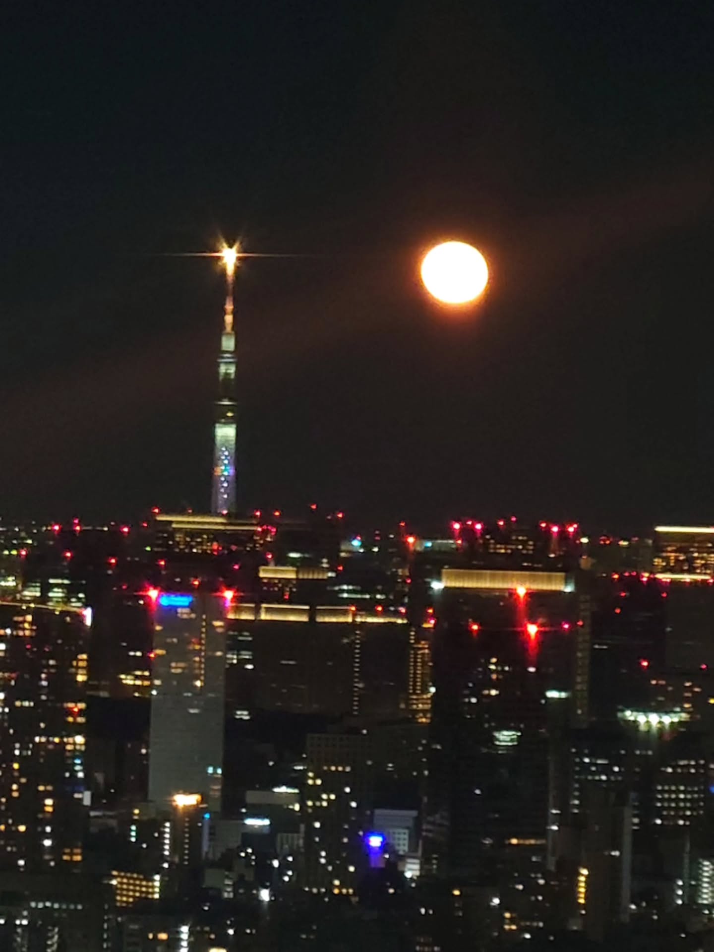 東京スカイツリーの右横に、まん丸い月が上がってきています
