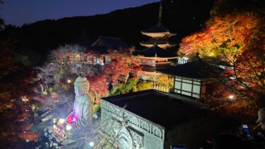◇近畿 和傘を携えた大仏さまとライトアップされた紅葉と三重塔